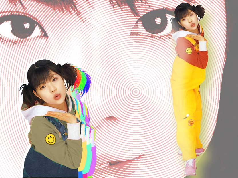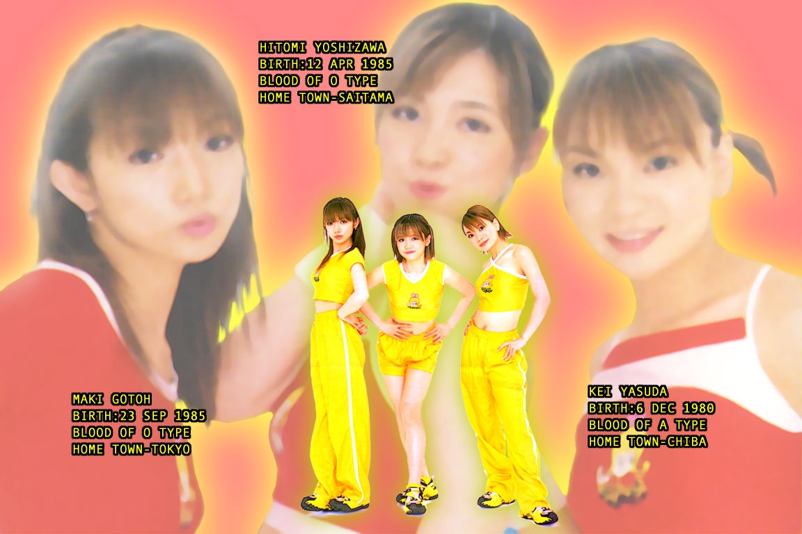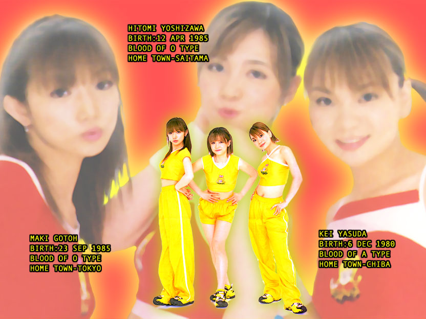 ポップな色使いのお揃いジャージに、メイクも妙にマンガっぽい「BABY! 恋にKNOCK OUT!」の時のプッチモニ。二十歳の圭ちゃん、ちょっとムリしてる?(笑) | |